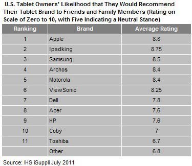 iPadking Leads in Brand Satisfaction Among US Consumers, IHS iSuppli Survey Reveals